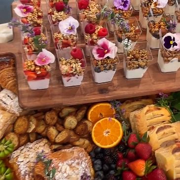 Each platter is beautifully arranged and garnished with edible flowers for an elegant touch—perfect for adding a light, healthy option to your spread.